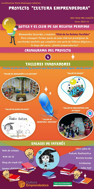 Este año nuestro gran reto, ha sido crear una Ruta Literaria en RA, llamada “Gotica y el Club de los Relatos Perdidos”, entre los tres pueblos que forman nuestro CRA, donde el alumnado ha elaborado sus propios relatos literarios literarios (a través del Proyecto de Biblioteca REBEX) sobre los lugares más emblemáticos de las distintas localidades, y ha diseñado una App en RA con accesibilidad cognitiva para realizar la visita literaria.
